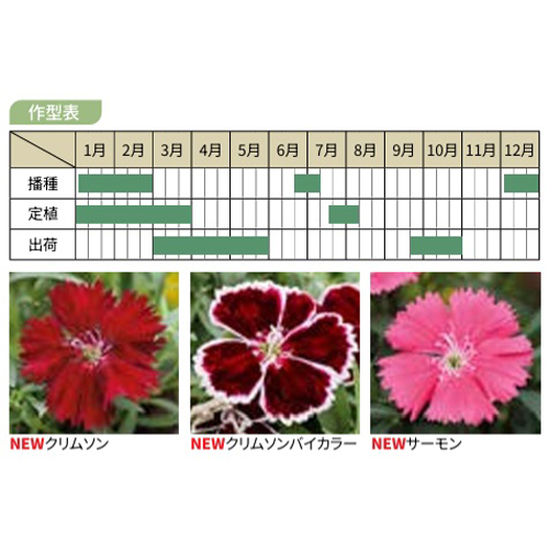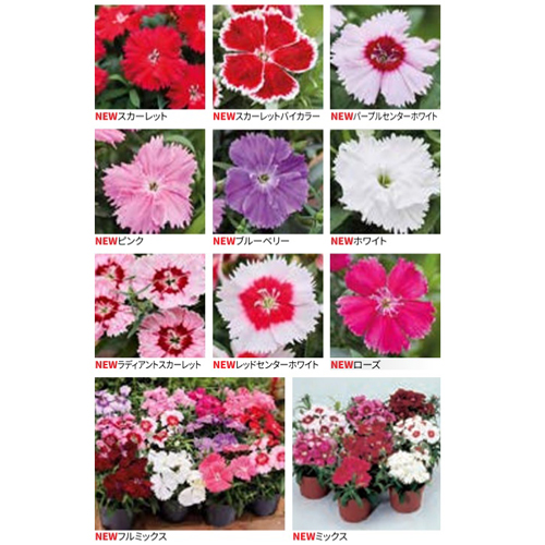シリーズ間の揃いが良く開花が早いコンパクトなダイアンサスです。ピコティ咲の特色のある花色だけをピックアップしました。花も大きく花上がりも良いので見ごたえもあります。出荷トレーにポイントで入れると効果的です。