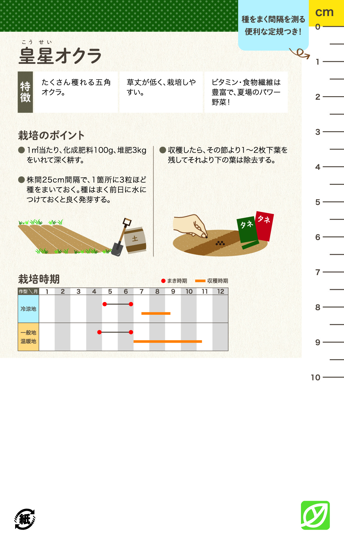 今回発売する種子は数ある品種の中でも家庭菜園でも育てやすい人気野菜29種。栽培が初めての方でも簡単に育てられるよう栽培方法をやさしく解説してあります。袋の裏面には定規がついていて、種まきや間引きに役立つほか、袋の表面には播種日が記入できそのままラベルになる便利な機能付きです。