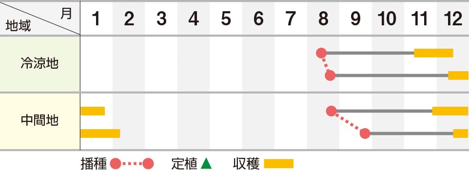 - 本種は生育日数75~80日位で播き幅の広い耐病性、耐寒性の強い品種である。