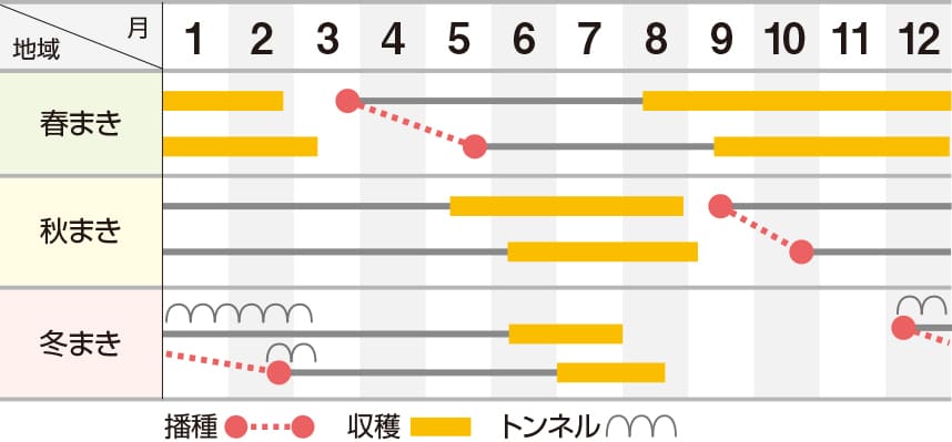 - 本葉3~4枚頃(種蒔き後50~60日)に間引きをし、中耕と追肥を行う。