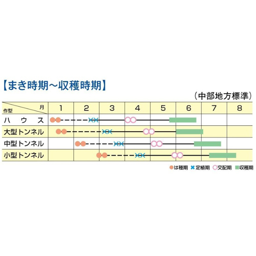 - ハウス半促成からトンネルまでの広範囲の作型に適します。登熟日数は5月収穫で50~55日、6月で48日前後、7月で45日を目安にし、必ず試し切りを行った後収穫してください。