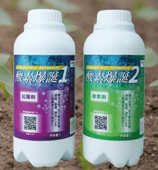 - 酸素爆誕は、2つの液剤を混合することで、土壌内に持続的に酸素を発生させる新しいタイプの酸素供給剤です。