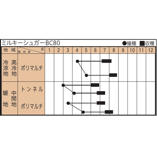 種まきから約80日で収穫でき、低温条件下でも発芽力が強いので、中間地のハウス栽培、トンネルマルチ。高冷地や寒冷地の早出し露地栽培に適する。