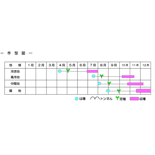 - 耐暑性に優れるため、高冷地の初夏穫り、平地の初秋穫りに向く。