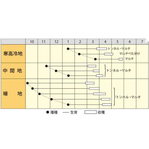 - 暖地の10月中旬~1月中旬まきトンネル・マルチ栽培、中間地の11月下旬~1月中旬まきトンネルマルチ栽培に適します。