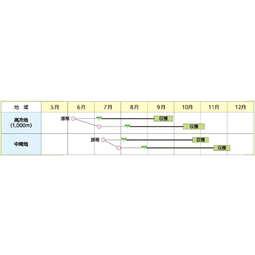- 高冷地作型では、8月収穫の場合、甲高になることがある。高冷地では9~10月収穫を基本とする。