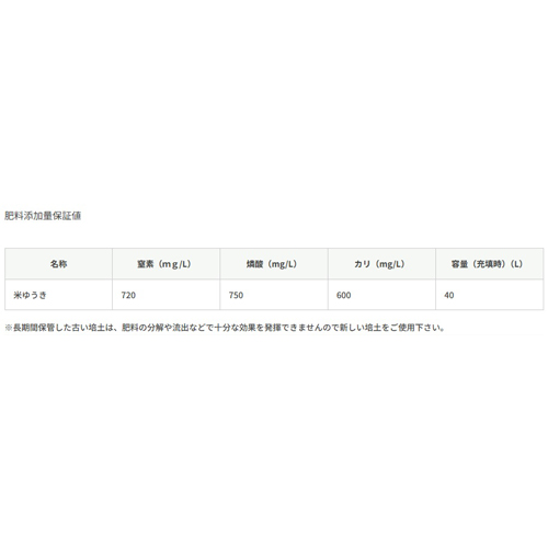 - 厳選した国産カツオ・マグロ魚粉(酸化防止剤無添加)をはじめ、ナタネ粕(一番搾り・薬剤無添加)、海藻、籾殻燻炭、灰、赤玉粒、北欧産ピートモス、パーライト、天然ゼオライト他をムラなく配合したミネラル・アミノ酸・炭水化物・微量要素 等を有する有機培土「ゆうきくん」と同じ肥料配合の優れた培土です。