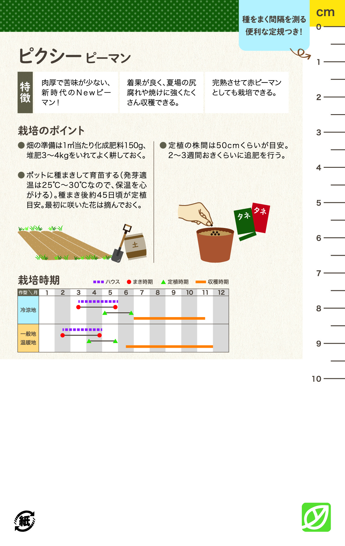 今回発売する種子は数ある品種の中でも家庭菜園でも育てやすい人気野菜29種。栽培が初めての方でも簡単に育てられるよう栽培方法をやさしく解説してあります。袋の裏面には定規がついていて、種まきや間引きに役立つほか、袋の表面には播種日が記入できそのままラベルになる便利な機能付きです。