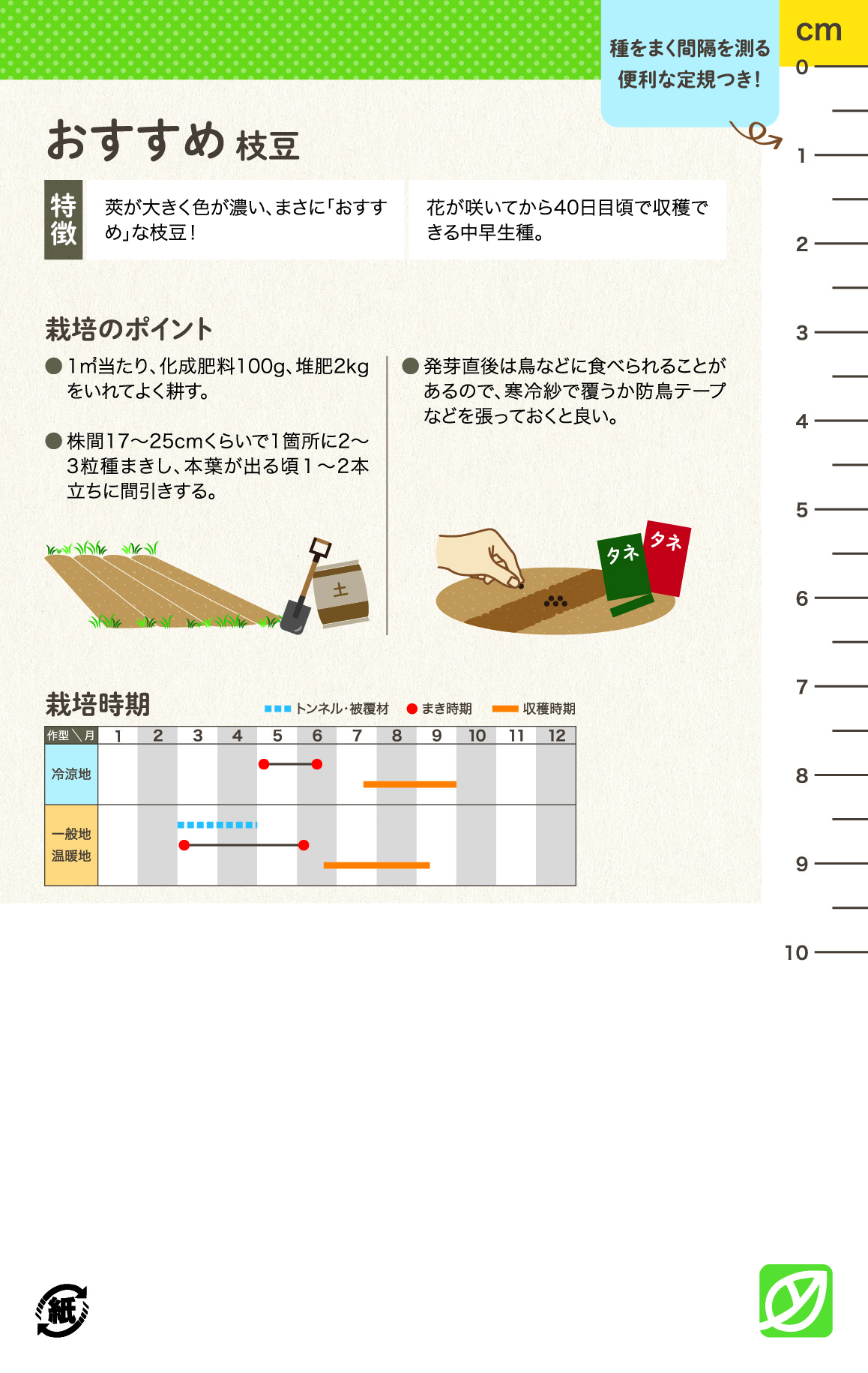 今回発売する種子は数ある品種の中でも家庭菜園でも育てやすい人気野菜29種。栽培が初めての方でも簡単に育てられるよう栽培方法をやさしく解説してあります。袋の裏面には定規がついていて、種まきや間引きに役立つほか、袋の表面には播種日が記入できそのままラベルになる便利な機能付きです。