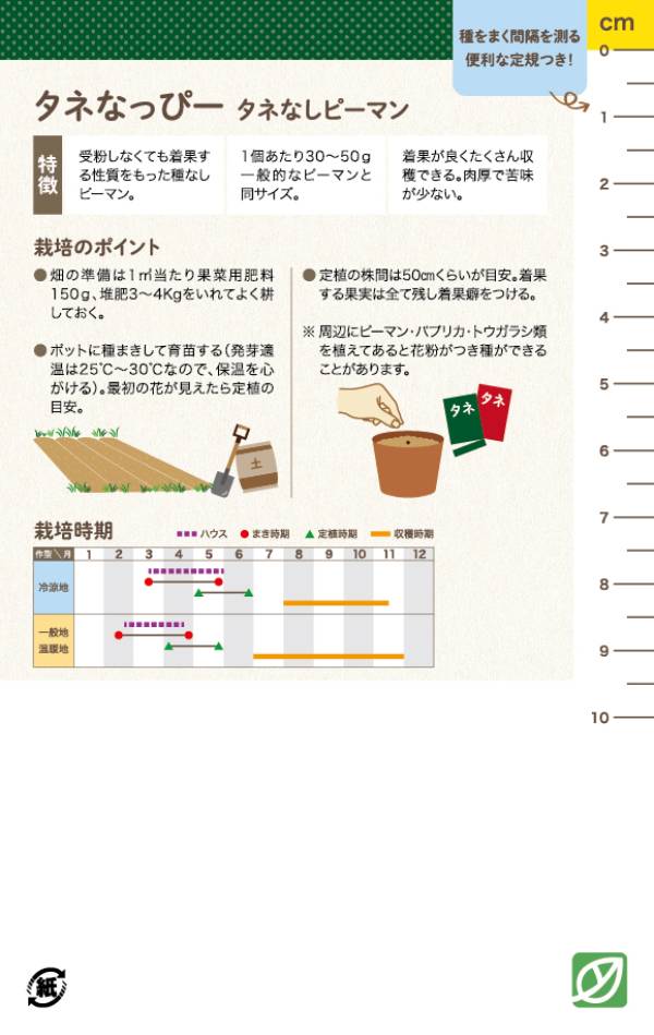 - 元肥は控えめにする。特に窒素肥料は少な目にする。 ※露地栽培では種有ピーマン・トウガラシ類の花粉が飛来し種が入る可能性があるのでハウス栽培を推奨。