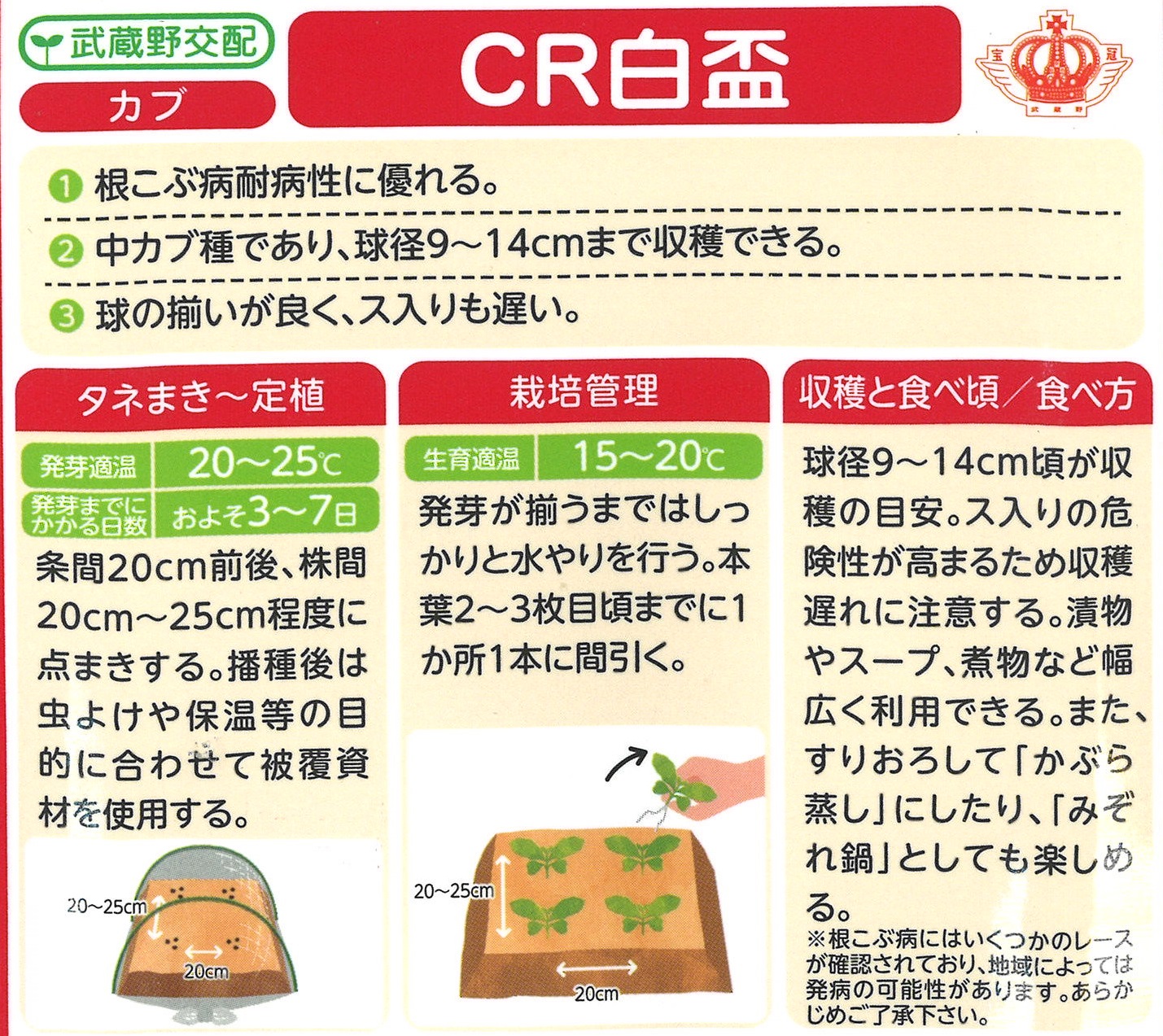 - 中カブ種であり、球径9~14cmまで収穫できる。
