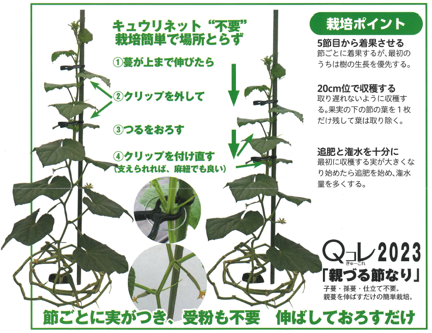 - 親つるの各節に受粉不要で着果する「節なり」品種。