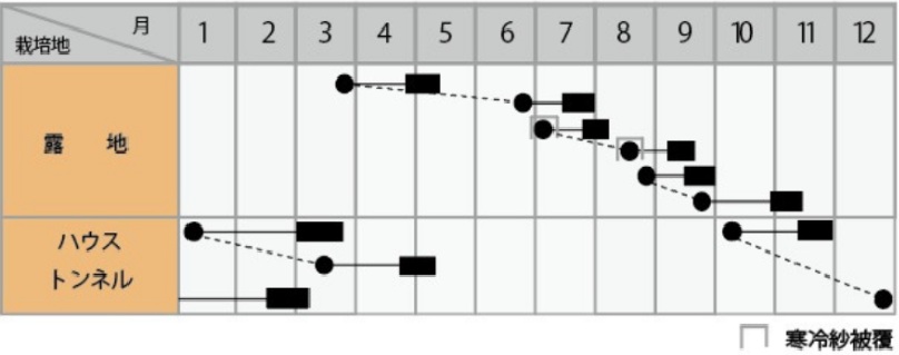 ハウス・トンネル栽培で10月中旬から3月まで栽培可能です。