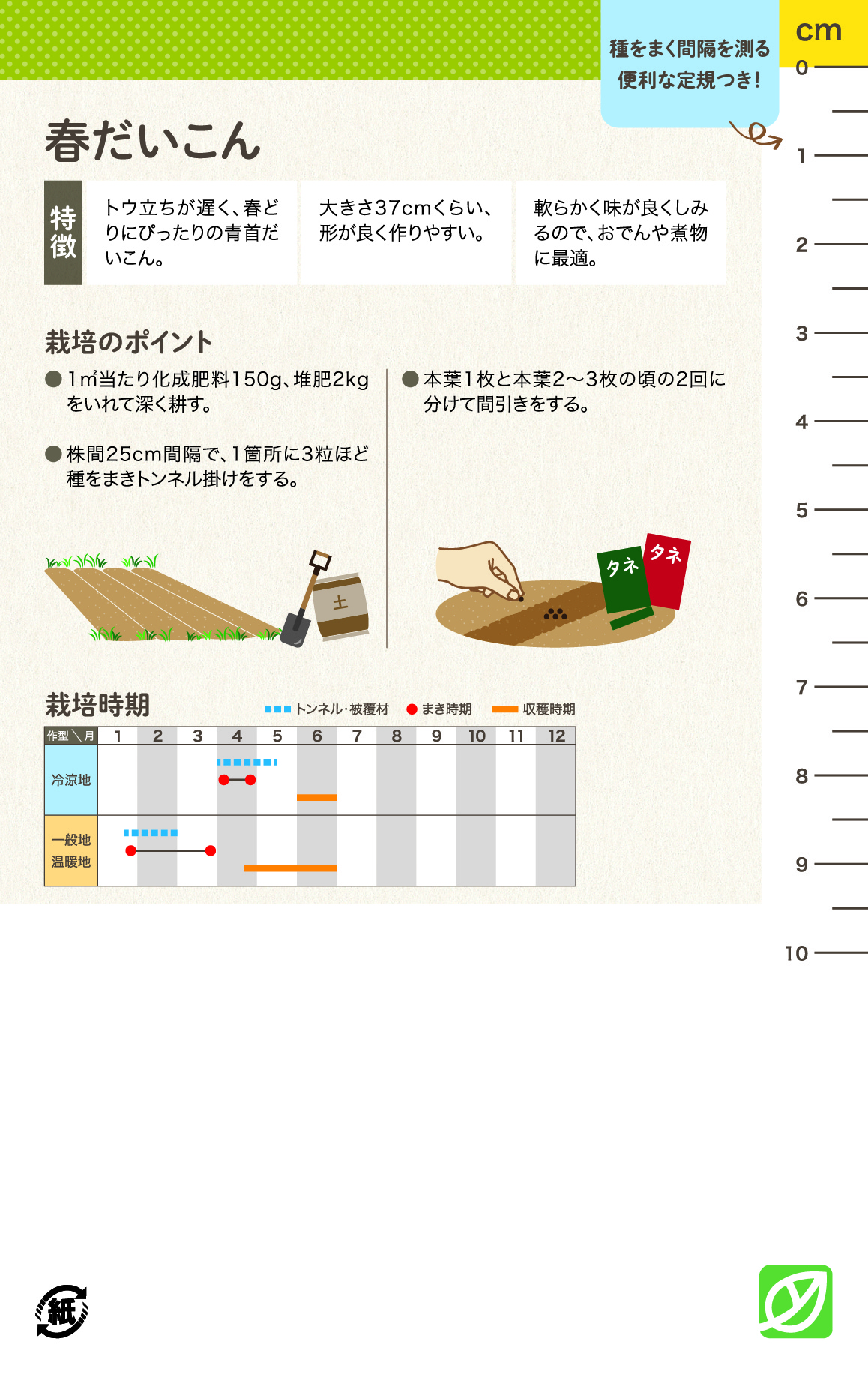 今回発売する種子は数ある品種の中でも家庭菜園でも育てやすい人気野菜29種。栽培が初めての方でも簡単に育てられるよう栽培方法をやさしく解説してあります。袋の裏面には定規がついていて、種まきや間引きに役立つほか、袋の表面には播種日が記入できそのままラベルになる便利な機能付きです。