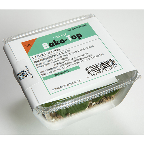 - バコトップは、タバコカスミカメの幼虫と成虫をカップに封入した製剤です。害虫の初期発生時に施設内に放飼すると、コナジラミ類、アザミウマ類の成虫や幼虫を探索し、大量に捕食します。