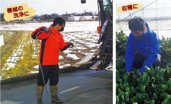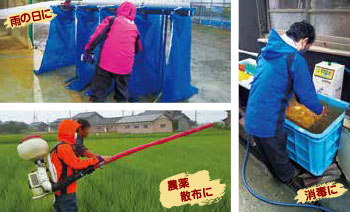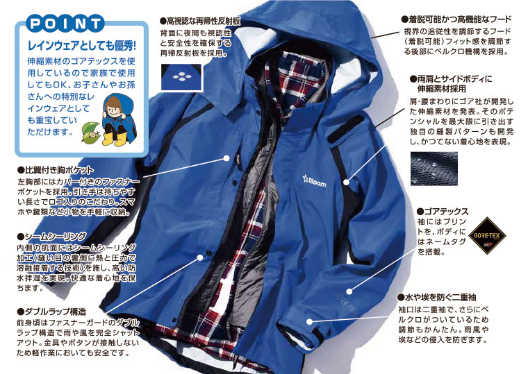 田中産業株式会社が開発したブルームウェアは、ゴア社の伸縮パネルを搭載しているよ。腕の可動範囲を広げ、激しい動きへの追随性を実現したんだよ。ストレッチを入れることで、風のバタつきによる疲労感を軽減するんだ。