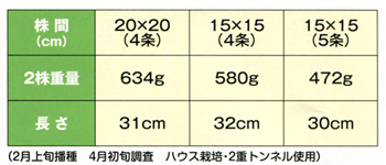 新しい出荷形態に取り組む場合は、15×15cm~20×20cm程度の極密植栽培を基本とします。